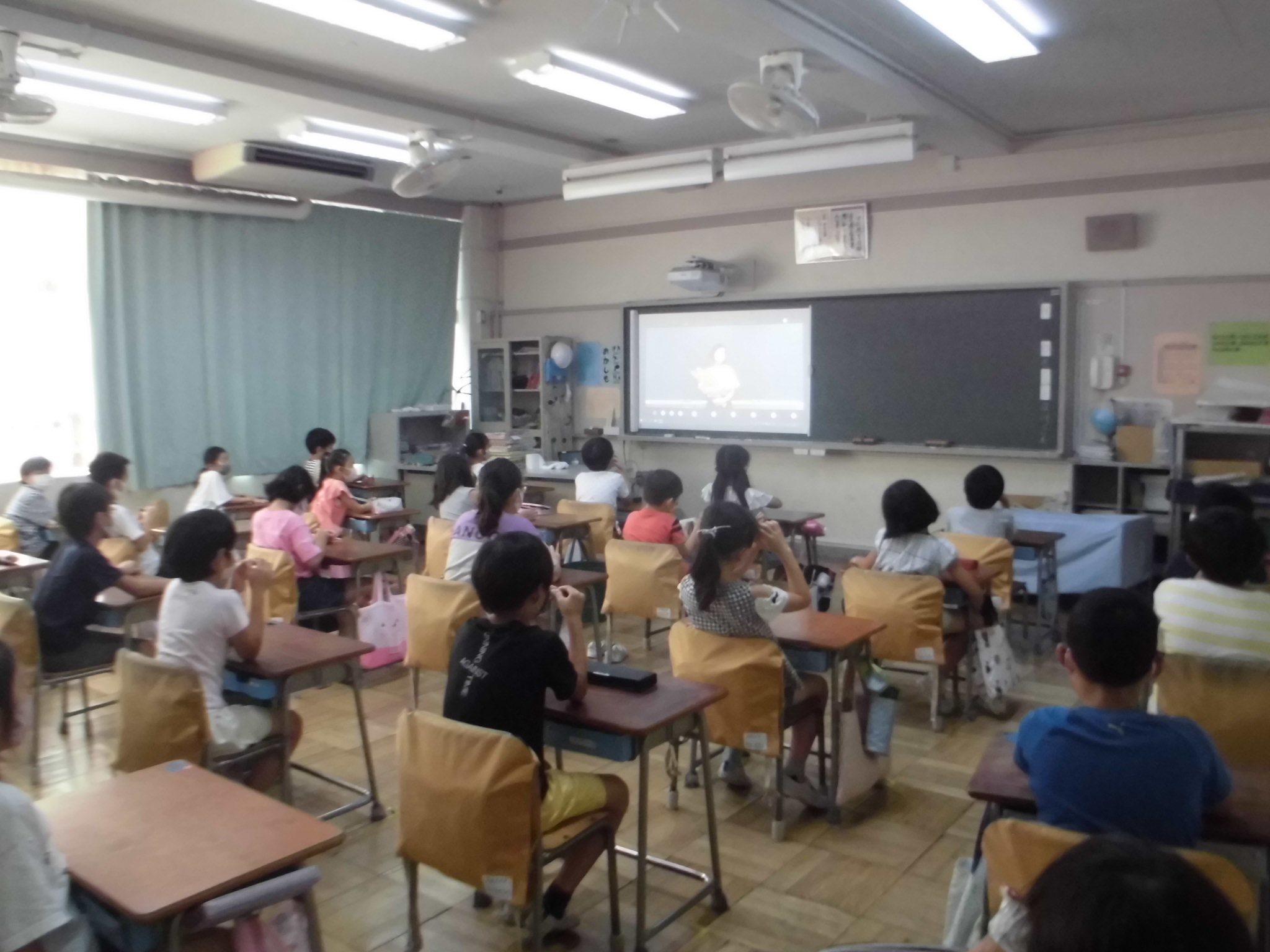 【9/7】全校朝会、子どもたちは教室で聞いています。