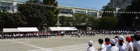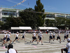 赤白それぞれのスタートちてんから、つなを引いている なわ のところに