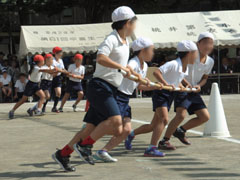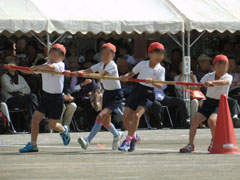 内がわの子は力をつかって外がわの子は走る力をつかってまん中の子は協力して