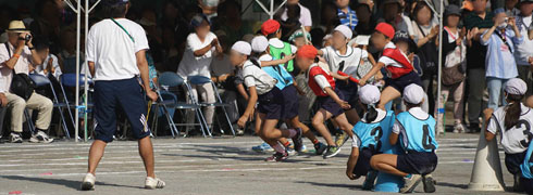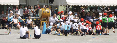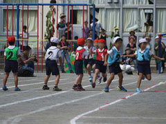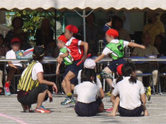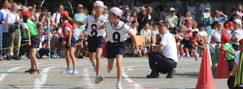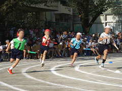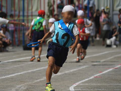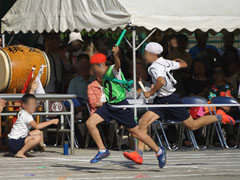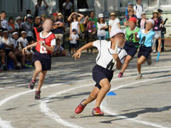 一、二年生が元気いっぱい走りバトンをつなぎます。