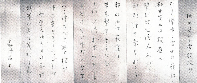 | 桃井第二小学校の校歌は、昭和11年に制定されました。 作詞は歌人・与謝野晶子さん、作曲は、音楽家・山本直忠さんによるものです。 |
