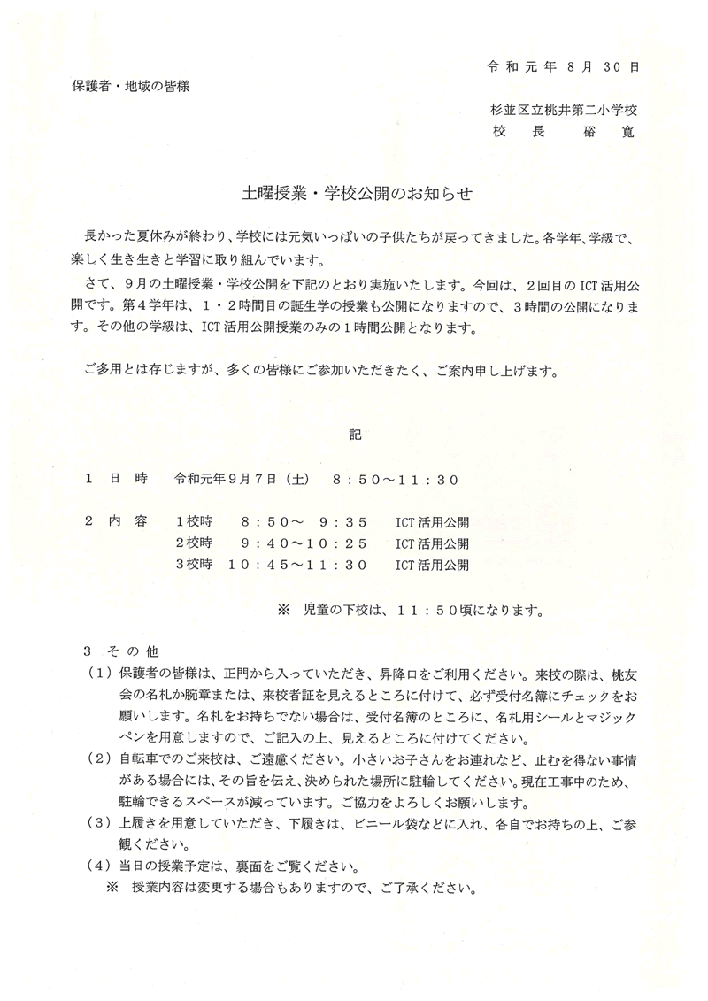 9月7日(土)に土曜授業・学校公開を実施いたします。