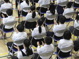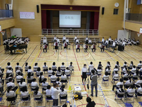 5/14、アリーナと各教室をつないで「リモート離任式」を行いました。