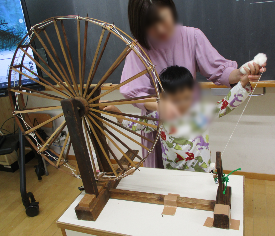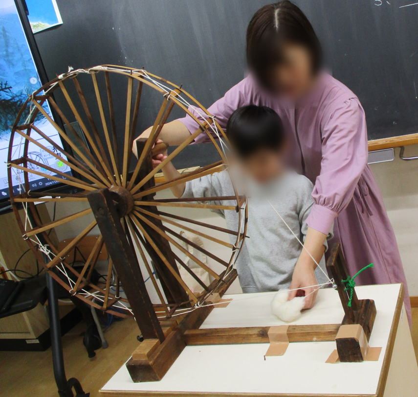 糸車を取り扱っている内田さんに、教室に来ていただきました。思ったより大きな糸車に驚きながら、
