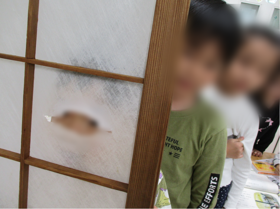 「破れ障子」から、たぬきがのぞく様子も、体験することができました。