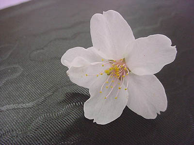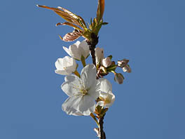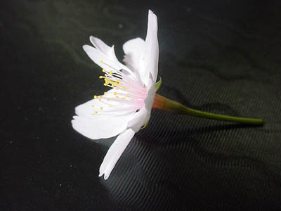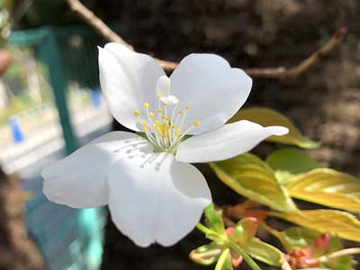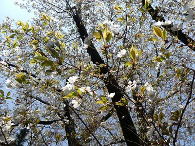 | 本来はオオシマザクラですが、「旗弁」と言って、おしべの1本が白い旗のように細長くなった花が咲きます。 残念なことに、木が年をとるにつれ、旗をつける花は減ってきています。 |