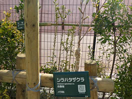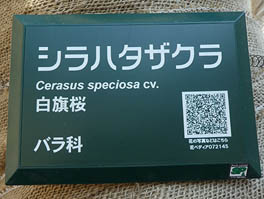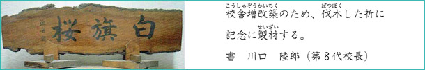 | 校舎と校庭が全部完成した春、白旗桜は新しい場所で花を咲かせました。 幹には真新しいプレートが付いています。 |