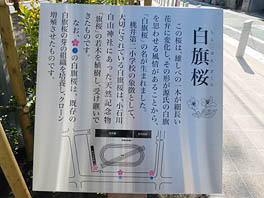 | <かつて桃二小の北側にあった解説プレート> | <小石川白山神社の白旗桜> |