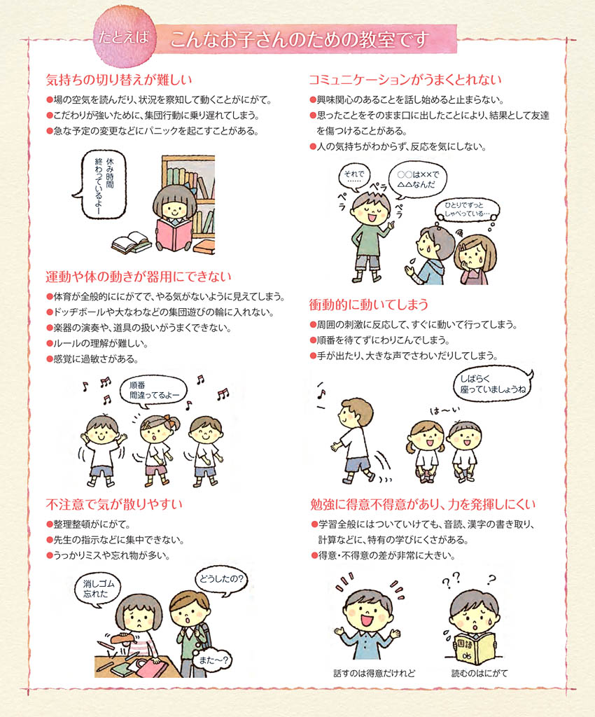 | 子どもたち一人ひとりが抱える困り感を改善することを目的とし、それによって現在学んでいる学校・学級での生活や学習に円滑に参加できるようなコミュニケーションの力や社会性を育てていく教室です。 指導の曜日は巡回校ごとに決まっています。普段所属する学級の授業時間中に1〜2時間特別支援教室で指導を行います。 |