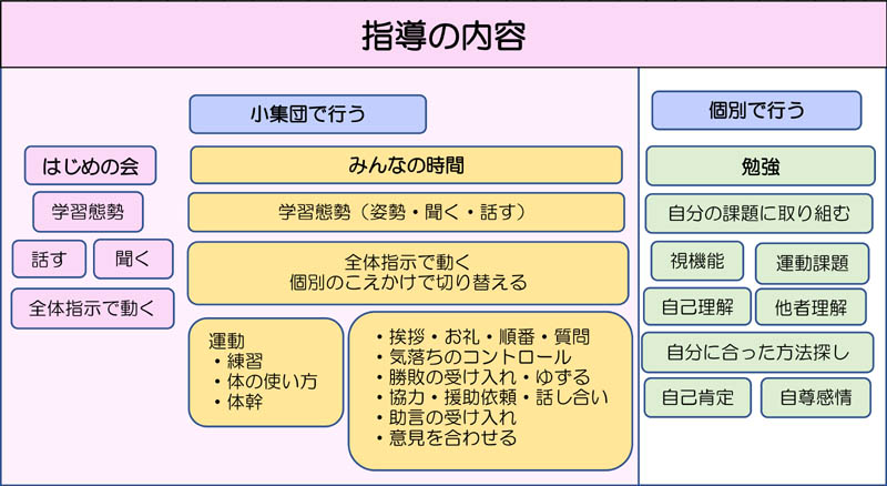 | 【個別学習】 2人〜6人の少人数の環境の中で友達とのコミュニケーションを楽しみながら、約束を守る態度や協力し合う気持ちが培われていくように場面を構成して指導しています。 |