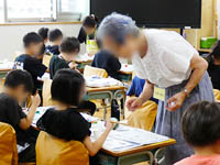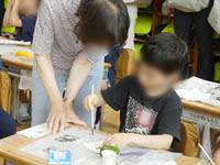 土曜授業・学校公開があり、1年生の「生活科」での「絵手紙」指導をサポートしました。