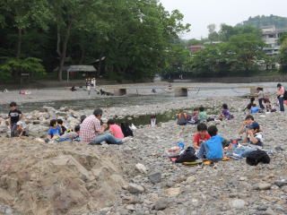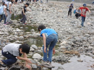 | お弁当の後は、おやつを食べて川遊び。 面白い形の石探しをしたり、 川沿いの生き物を探したり、楽しんでいました。 |