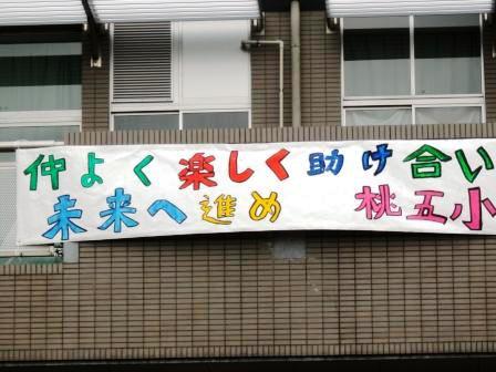 スローガンは 「仲よく楽しく助け合い、未来へ進め 桃五小」です。 |