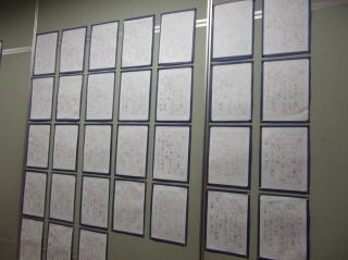 高学年のめあては 「文字の組み立て方に注意して、字形を整え、縦長の紙に、字配りよく書く」です。 5年生は、難しい仮名に注意しながら、字配りよく書きました。 6年生は字数も多く、難しい課題でした。文字の大きさにも注意しながら堂々と書くことができました。 |