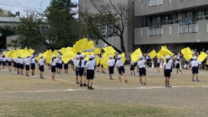 | <校長先生から言われた幸せ「黄色」の旗を大きくふって表現していました> | |