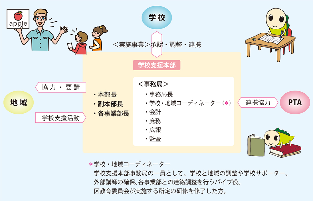 学校支援本部は、子供の教育を学校任せにするのでなく、地域の人たちと一緒になって区立小・中学校の教育活動などを支援するために設置された、ボランティアによる組織です。