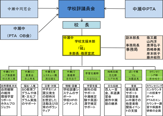 学校支援本部は、学校の教育活動をより一層、充実・発展させることを目的に、地域の方々を中心に作った仕組みです。平成22年度、杉並区すべての小中学校に設置する予定です。 本校の学校支援本部は、「結(ゆい)」と名付けました。結はかつて日本の各地に見られた相互扶助の組織で、田植えや屋根葺きなどの生産や生活のために欠かせないものでした。 「中瀬結」は子育てという大事業に、中瀬中学校区の大人たちの力を結集するものです。そして「中瀬結」の活動を通して、地域の中に新たな文化を創造することを願うものです。