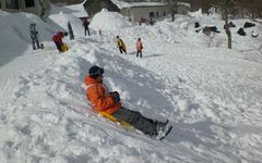 ホテル裏の傾斜地でソリ滑りをします。約5mの落差を上手く利用すると、