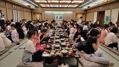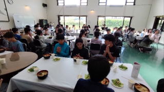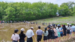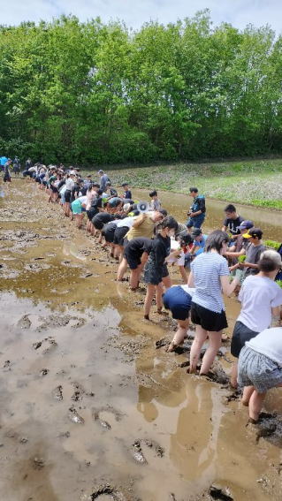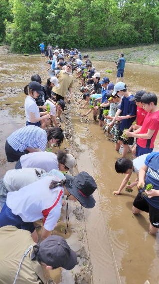 2日目(5月8日) 今日の八ヶ岳高原の天気は、最低気温5℃、最高気温16℃で、昨日に引き続き快晴です。明け方は肌寒い気温でしたが、日中は日差しがあり、暖かさを感じる1日となりました。 6時30分に起床し、荷物をまとめ、7時から朝食を取りました。 9時に宿舎を出発し、田植え体験を行う高根クラインガルテンに向かいました。クラインガルテンでは施設の方の説明のあと、少し離れた田んぼに向かい、早速田植えのスタートです。裸足で田んぼに入るところで、大歓声が響き渡り、男女1列になって苗を植えていきます。中には尻もちをつく人もいて、悪戦苦闘していました。約40分間、貴重な体験を行いました。その後、施設の中庭でクラス写真と学年写真を撮りました。 そして昼食は山梨の郷土料理であるほうとうをいただきました。昼食も食欲旺盛でおかわり続出でした。昼食後、閉校式を行い、1泊2日のフレンドシップスクールを終えました。