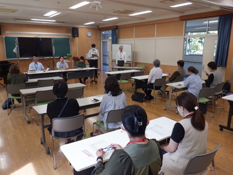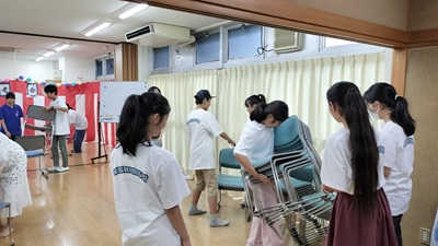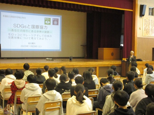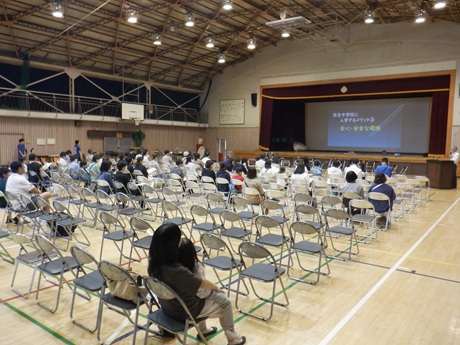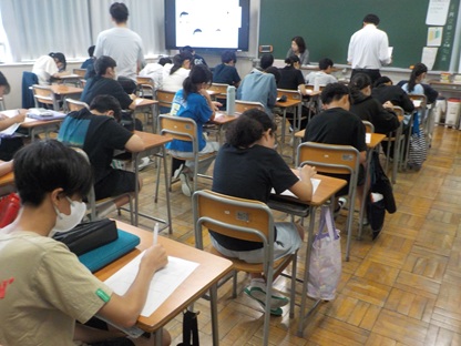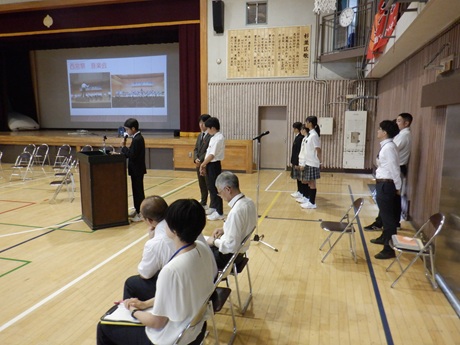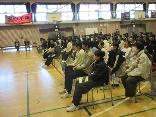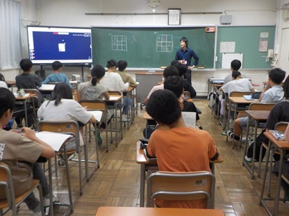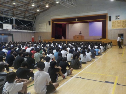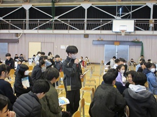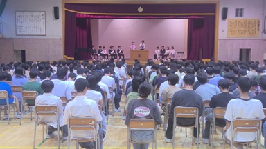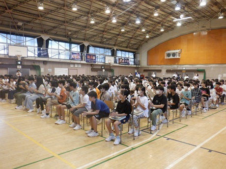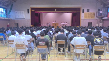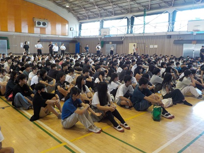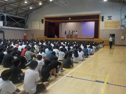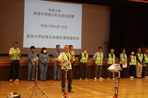 現生徒会(第64期)が主催する最後の生徒会朝礼がありました。図書委員会の表彰、ペットボトルキャップ回収や異学年交流祭開催についての連絡の後、現生徒会長の最後の挨拶がありました。 今期の生徒会は西宮中をよりよくするために、役員一人一人が掲げた公約の実現に向けて取組を行い、西宮中の新たなレガシーを築きました。お疲れさまでした。 R7年9月5日 生徒会役員選挙 第65期生徒会役員選出のための選挙が行われました。投票に先立ち、1年生・2年生の候補者が立会演説を行い、生徒会役員としての抱負や目標を表明しました。全校生徒は各候補者の訴えを真剣に聞き、投票する候補者を考えていました。 立会演説会のあと、投票を行いました。投票は実際の選挙に使われている投票箱をお借りして行われました。 ![]() 今年度は「思考力・判断力・表現力の育成 ~話し合いを深める活動を取り入れて~」をテーマに、教員の校内研修を実施しています。学習指導についての研修は今回が3回目で、4人の教員が授業を行い、全教員が4グループに分かれて研究協議を行いました。 ![]() R7年9月1日 防災の日に合わせた防災教育 102年前の1923年9月1日に発生した関東大震災の被害を教訓に定められた防災の日に合わせて、避難訓練を実施しました。今回は地震によって発生した火災を想定した訓練を行いました。生徒たちは自分の身を守る行動をとろうとする真剣な態度で臨んでいました。今後もさまざまな場面を想定した訓練を行っていきます。 本日の給食は、避難所に避難したときのことを想定した防災食メニューを設定しました。「救給カレー」という名称のアルファ化米を使ったレトルトカレー、非常食用クラッカーを使ったサクサクチキン、具沢山のすいとん。いつもとは異なるメニューでしたが、家庭での防災対策を考えるきっかけになればと思います。 ![]() ![]() R7年8月28日 第2学期始業式 39 日間の夏休みを終え、生徒たちは元気に登校しました。始業式では夏休みの成長と2学期の学校生活について校長から講話をしました。2学期は、特に日々の学習において興味・関心のあることを探究してほしいということや、学校行事での活躍を期待していることなどについて話をしました。 R7年7月19日 第1学期終業式 1学期の教育活動は本日、無事に終了することができました。終業式の冒頭の校歌斉唱では、1学期の充実度を表しているかのような大きな歌声で歌うことができていました。1学期の成長はどうだったでしょうか。終業式の後、各クラスでは学級担任から通知表が手渡されました。来週からの三者面談では学級担任から生徒の成長を詳しくお伝えします。夏休みは学力や体力以外の心の成長を期待しています。2学期の始業式を楽しみにしています。 R7年7月2日~4日 第2学年 職場体験学習 毎年、2年生を対象に3日間実施している職場体験学習に、今年も約50か所の事業所の協力をいただくことができました。生徒は事業所ごとの職業を体験することで、働くことの意義を理解し、将来の自己実現に向けて考えることができました。生徒を受け入れていただいた事業所様にはこの場をお借りして御礼申し上げます。 R7年6月27日 第3学年 社会貢献教育 杉並区社会福祉協議会ボランティアセンターの担当の方から、ボランティアについての講話を伺いました。今後もボランティアの機会がたくさんありますので、今日の講演を参考に、ぜひボランティア活動に参加してほしいと思います。 R7年6月26日 第2学年 音楽鑑賞教室 毎年、2年生を対象に開催されている音楽鑑賞教室ですが、今年は杉並公会堂に会場を戻して行われました。杉並公会堂を本拠に活躍している日本フィルハーモニー交響楽団の素晴らし演奏を鑑賞することができました。 R7年6月17日~19日 第1回定期考査 今年度最初の定期考査を実施しました。1年生は初めての定期考査でしたが、1週間前から行われた学校支援本部(共育支援本部)主催のアフタースクールスタディ(放課後自習教室)には、たくさんの1年生が参加し、しっかりと準備をして本番に臨んでいました。努力の成果は結果に表れていることでしょう。 R7年6月13日 第3学年 震災救援所訓練(防災教育) 本校震災救援所運営連絡会、地域・保護者・関係機関、区役所各課の皆様の御指導・御協力のもと、3年生を対象にした震災救援所訓練(防災教育)を行いました。今年度は、車いすの操作方法、仮設ベッドの組立方法、発電機の操作方法の3つの訓練をクラスごとにローテーションをしてグループ単位で行いました。各グループの訓練では、生徒一人ひとりが必ず訓練を体験し、身をもって技能を習得できるように工夫していただきました。また、各訓練の合間には防災に関するクイズが3題ずつ、合計9題出題され、クラス対抗で正答を競うなど、楽しく学べる工夫もしていただきました。ちなみに、クラス対抗の結果はA組とB組が同点となり、学級担任がジャンケンをして、B組の優勝が決まりました。 実際に震災救