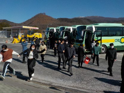 R8年2月4日 第2学年菅平スキー移動教室(1日目) 午前8時、2年生は予定通り、元気に井の頭通りを出発しました。 関越、上信越自動車道を順調に進み、午前10時40分に最後の休憩箇所である東部湯の丸SAに立ち寄りました。北アルプスの真っ白な山なみに、みんな感動していました。