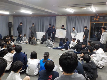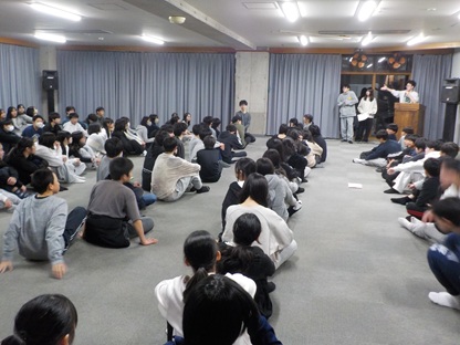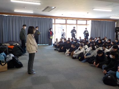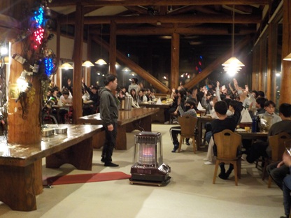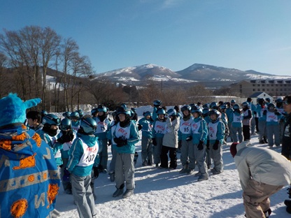 午後12時、菅平の宿舎に到着してすぐに開校式を行いました。実行委員、校長の挨拶、スキースクールのインストラクターの皆さんとの初顔合わせ、宿舎の代表の方の挨拶、引率者の紹介などがありました。