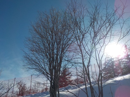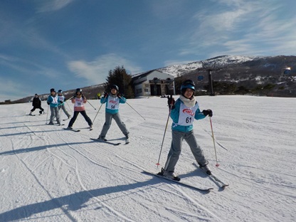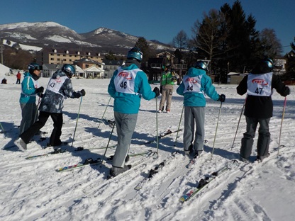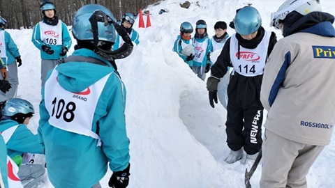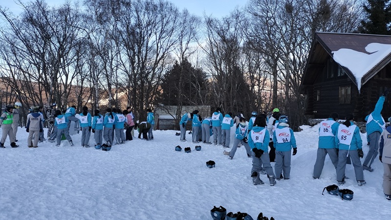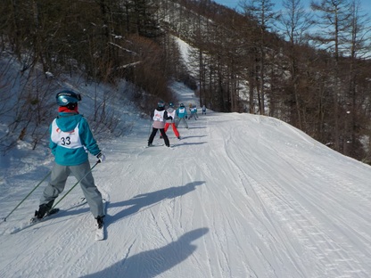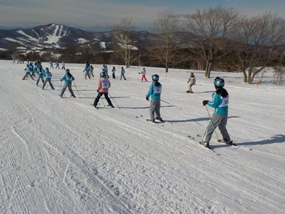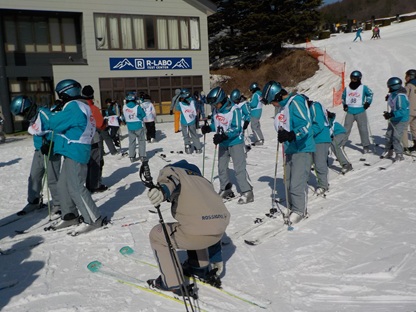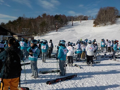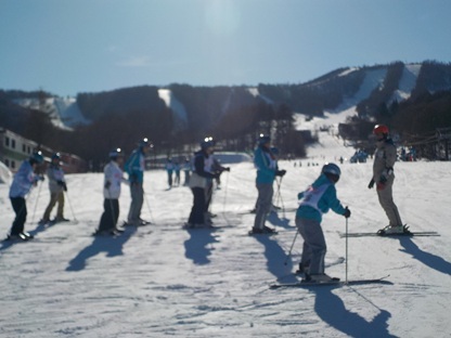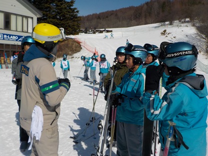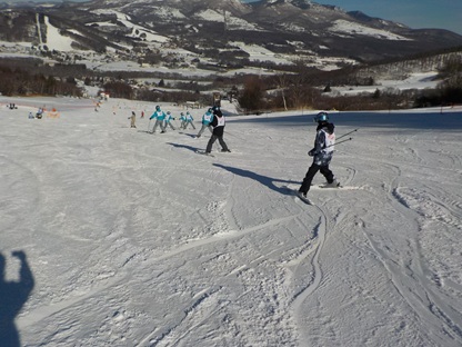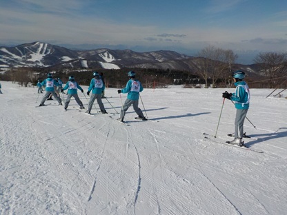 昼食をとり、午後2時より、早速、午後の講習が始まりました。ゲレンデは快晴で寒さもあまり感じることのないとてもよいコンディションです。早速、リフトに乗る班もあり、レベルに応じて丁寧に指導していただいています。