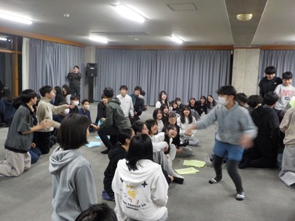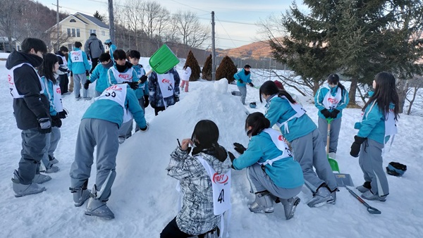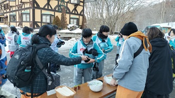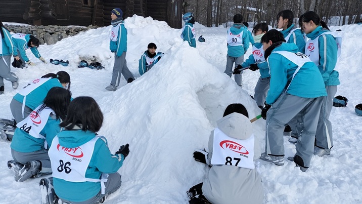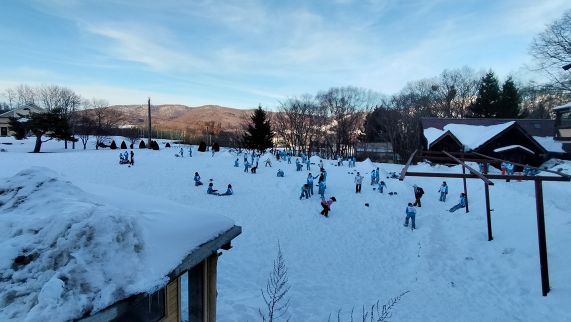 午後の講習は4時に終わり、宿舎前の広場に集合しました。一面の雪で自然と雪合戦が始まりました。しばらくして、インストラクターの皆さんと一緒に2班で1つのかまくら造りを体験しました。東京ではできない体験で、楽しそうに取り組んでいました。その後、熱々の豚汁をいただき、今日の活動は終了しました。