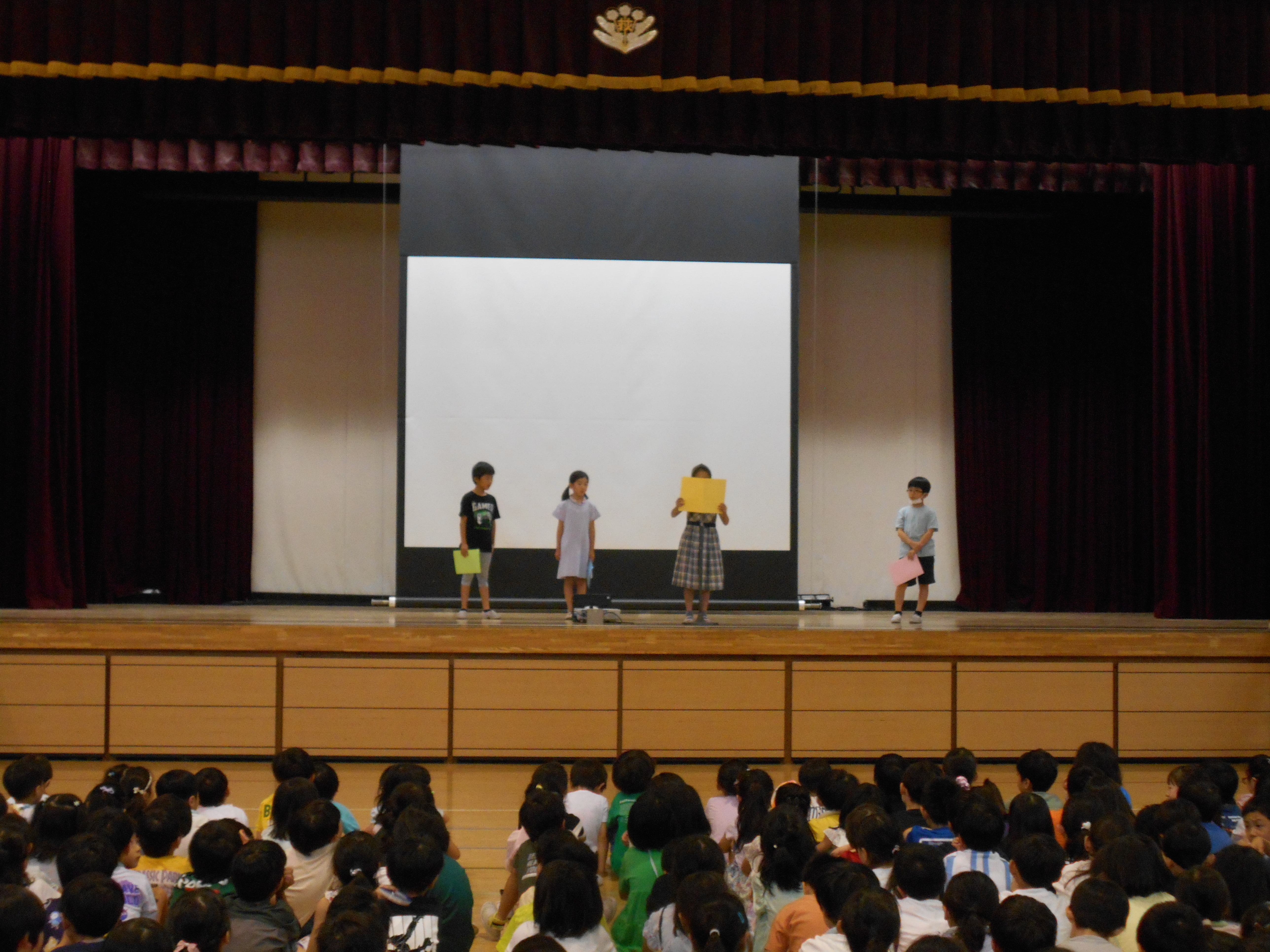校長先生からは「目標」について、「目標はかざりではなく、達成させるもの」1学期の最初に立てた目標を振り返り、また2学期に向けて努力を続けていこうというお話があり、児童は真剣に聞いていました。
