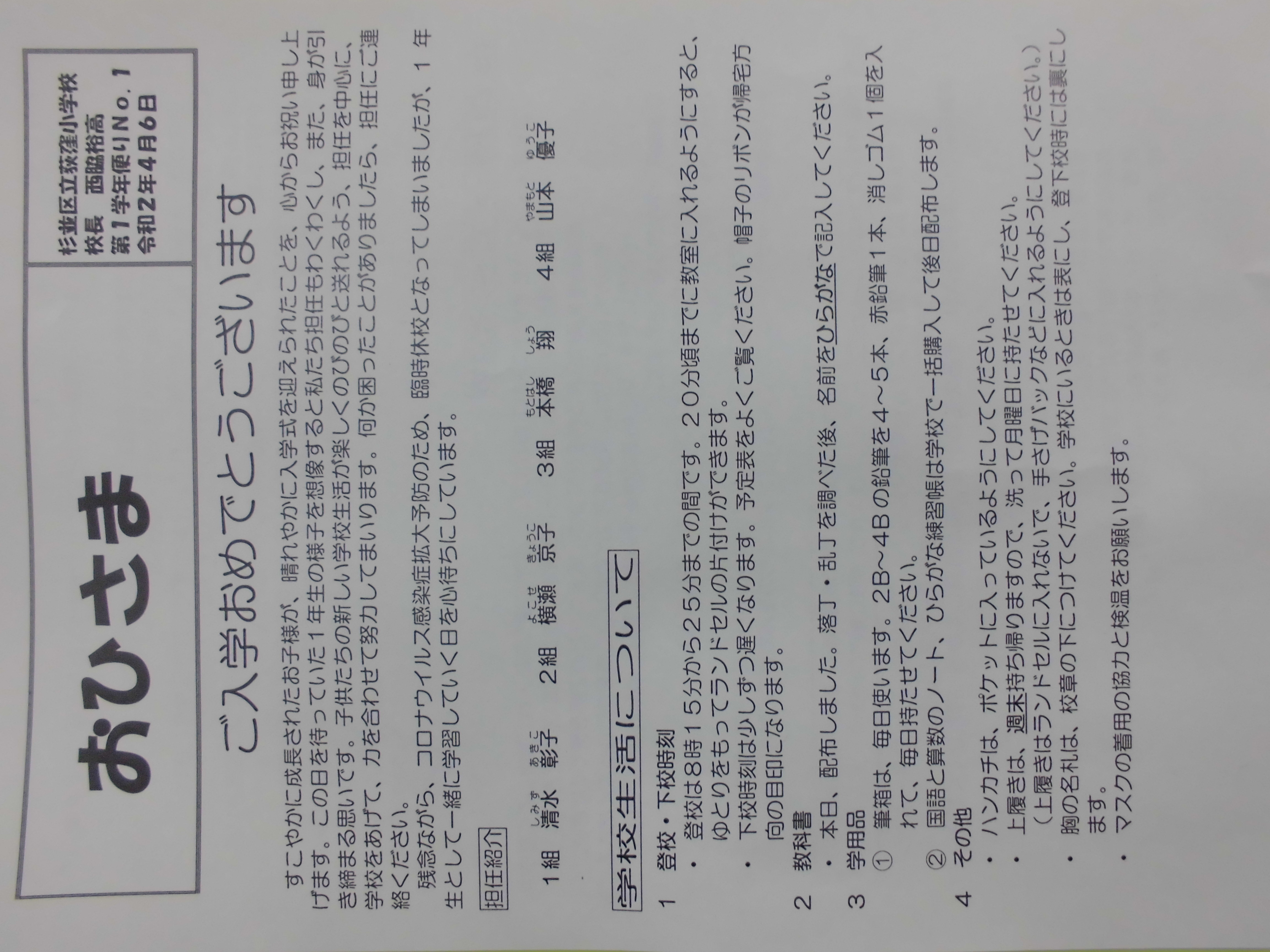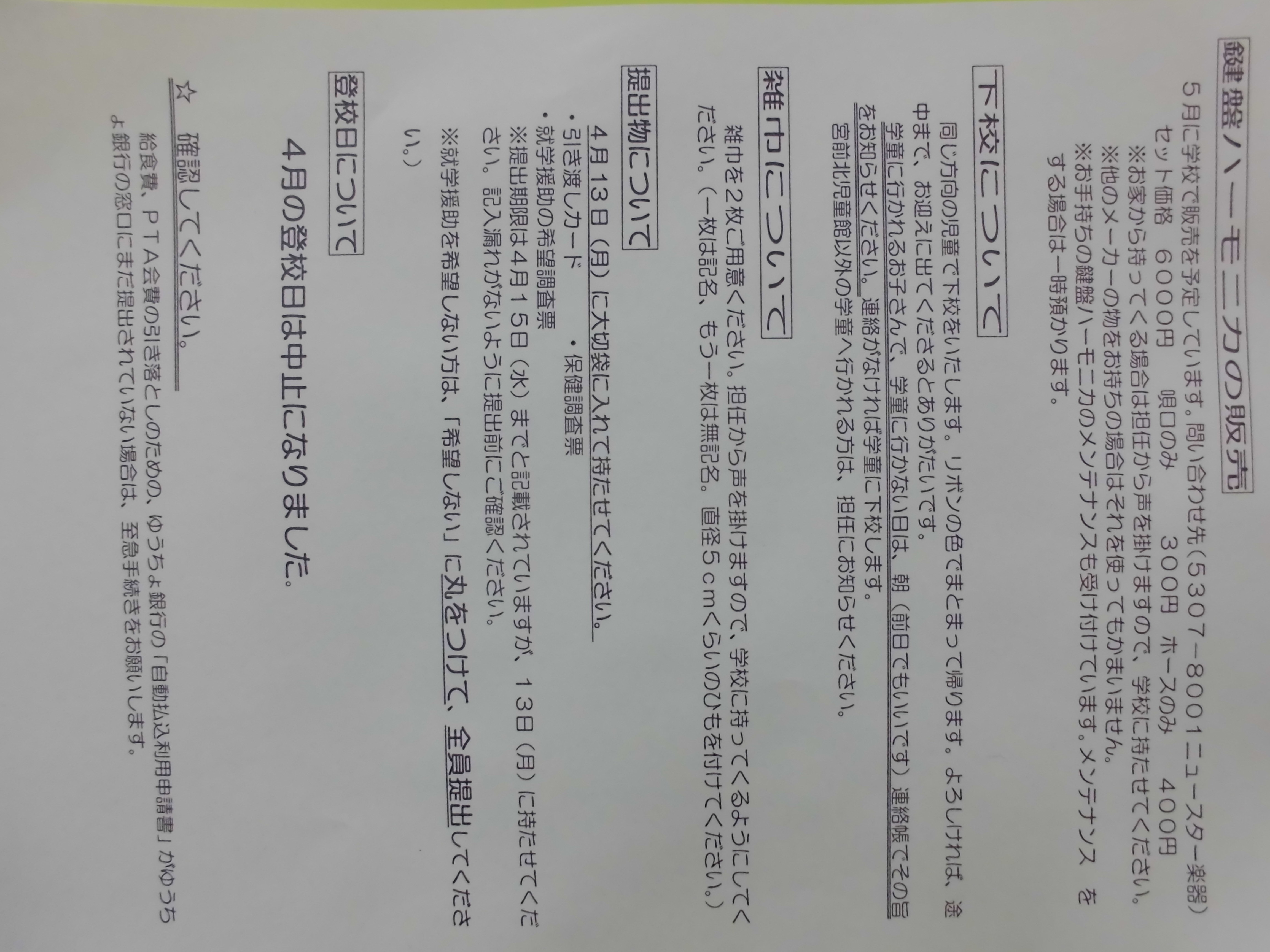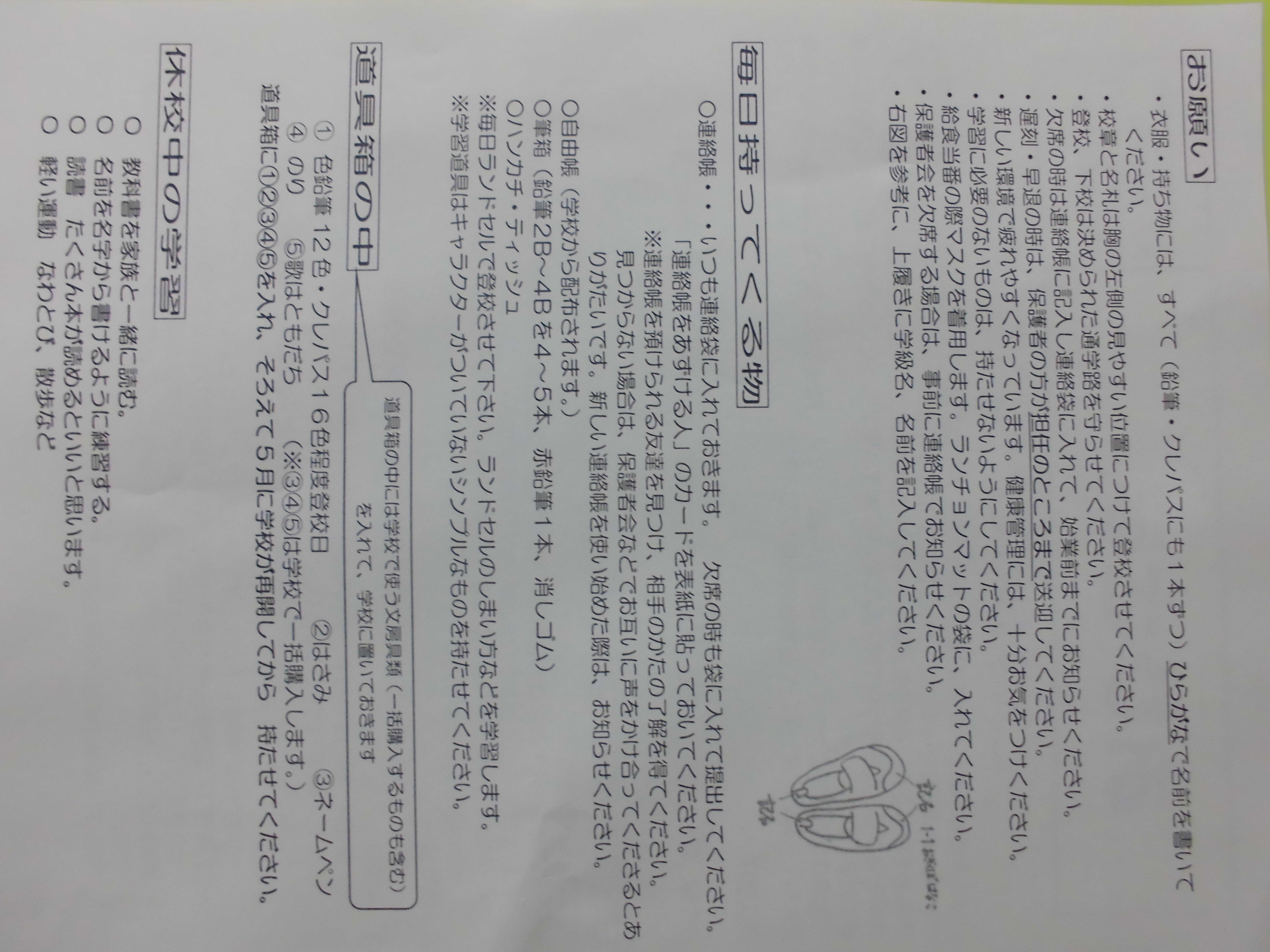 らいしゅうからは2がっきがはじまります。はやねはやおきはできていますか。せいかつのりずむをととのえて、げんきにがっこうにきてください。みんなにあえるのをたのしみにしています。