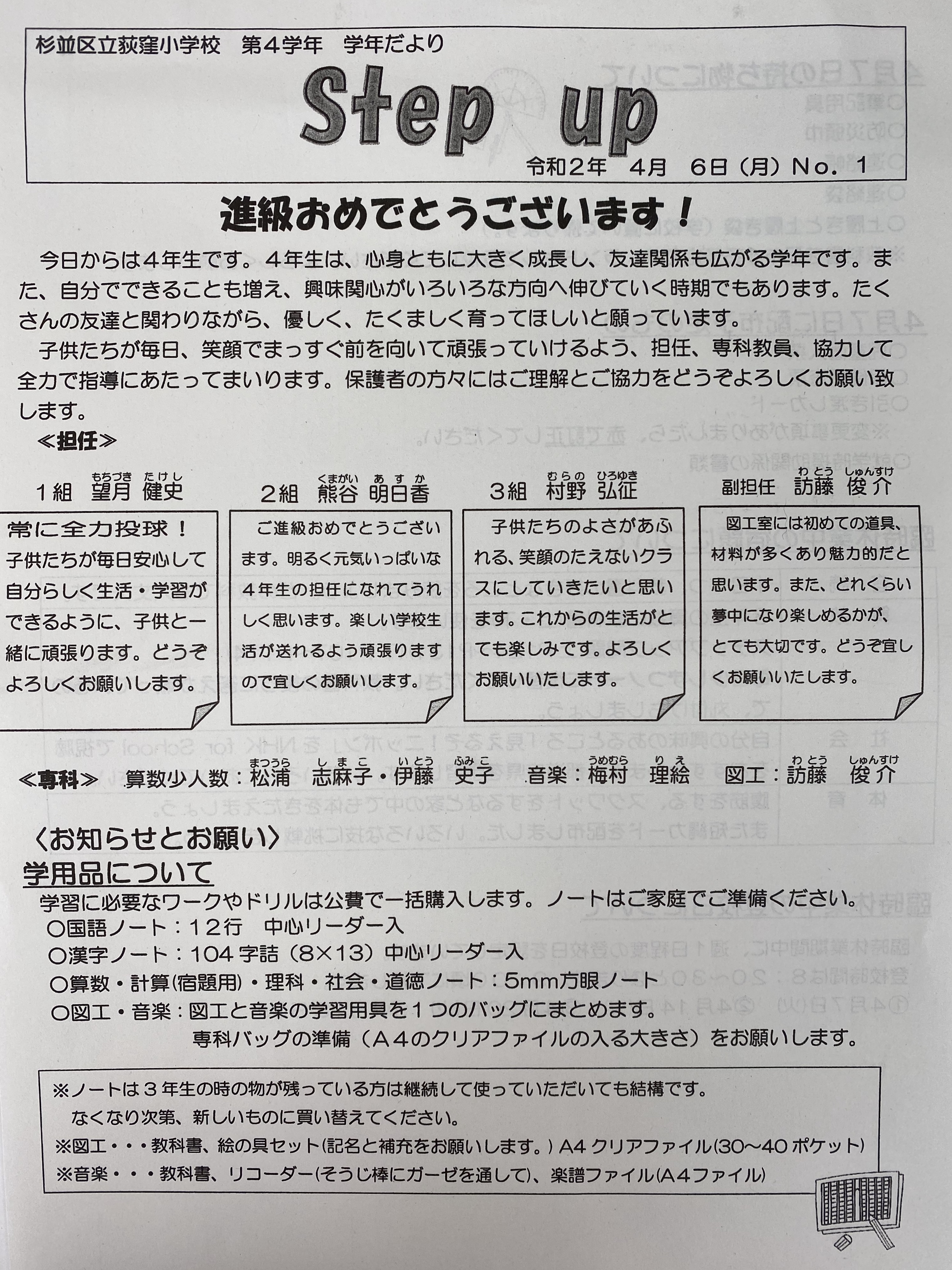 4年生のみなさん、元気にしていますか。連休明けに学校が始まるのを楽しみに待っていてくれた人も多いと思いますが、緊急事態宣言が継続となり、学校の臨時休校は先生たちも想像していなかったほど長くなりました。まだまだSTAY HOMEは続きますが、みんなで危機を乗り越えましょう。