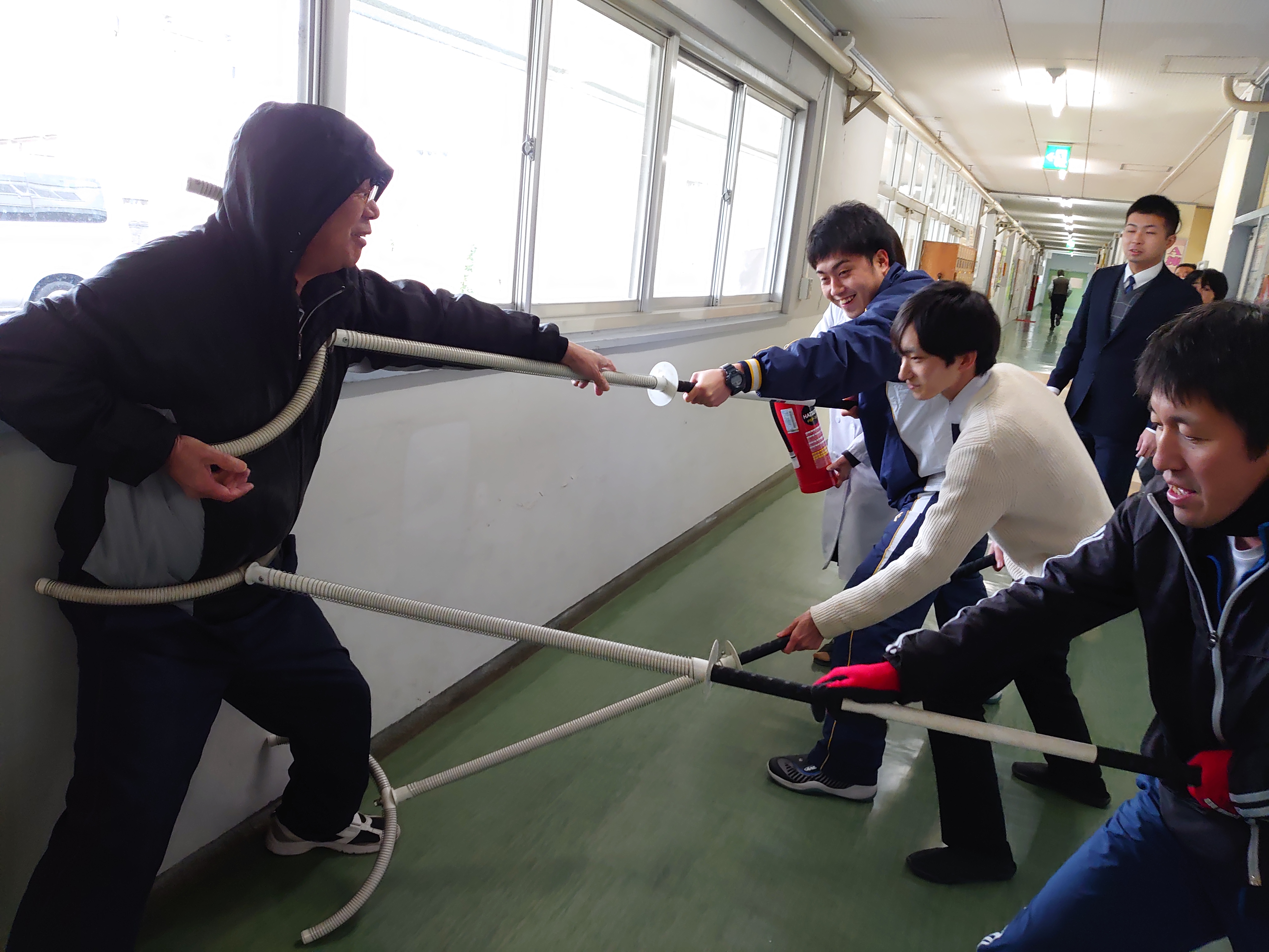 | 毎月実施している避難訓練ですが、年に一回は不審 者対応訓練を実施します。高井戸警察の方に来てい ただいて、刺す又の使用法等レクチャーを受け、警察 の方が不審者に扮しての実践。授業中の生徒は、教 室でバリケードを作り対応しました。 |