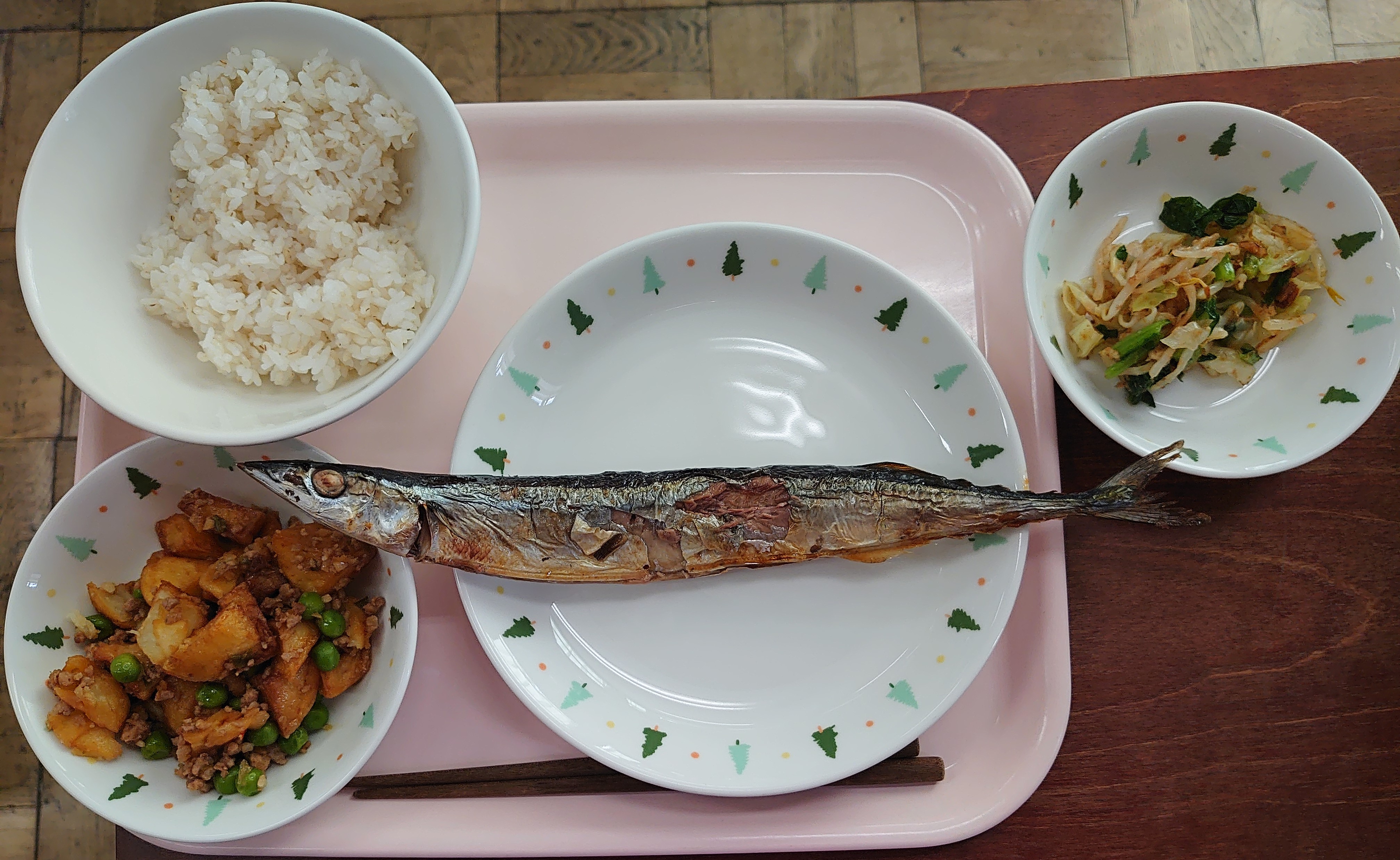 | 水産物普及改善協会のお魚マイスターの方に来ていた だき、、魚についての学習をしました。それを受けて、給 食は、サンマの塩焼き。上手に骨を取って食べられまし た。 |