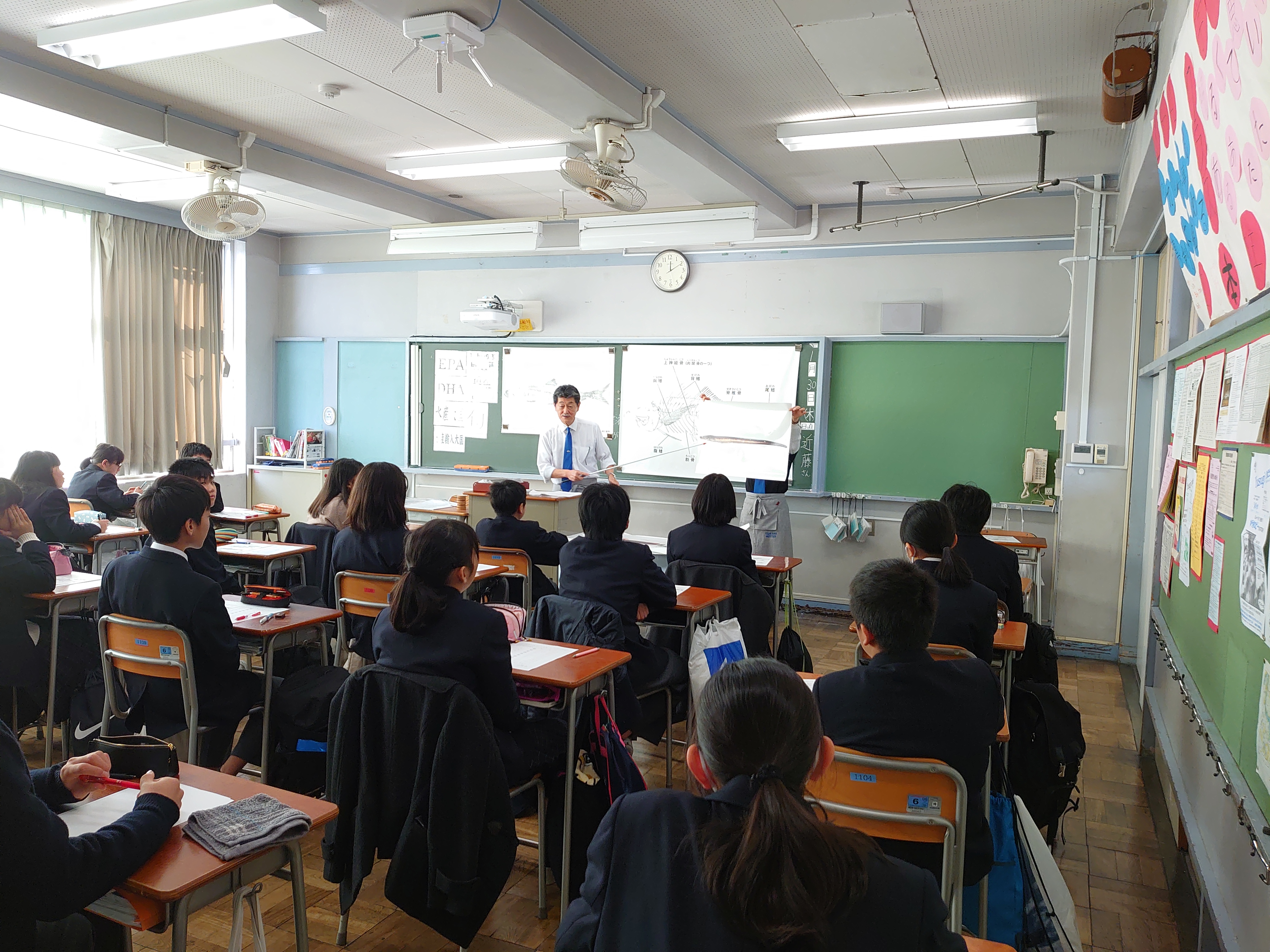 お魚マイスターからのクイズ Q 下記の魚介類の読み方はわかりますか? 1 鰯 2 鮭 3 鮎 4 鱈 5 鯵 6鯖 7 鰹 8 鮪 9 河豚 10 翻車魚 難問10番 正解者は1Aの男子一人でした。 |
