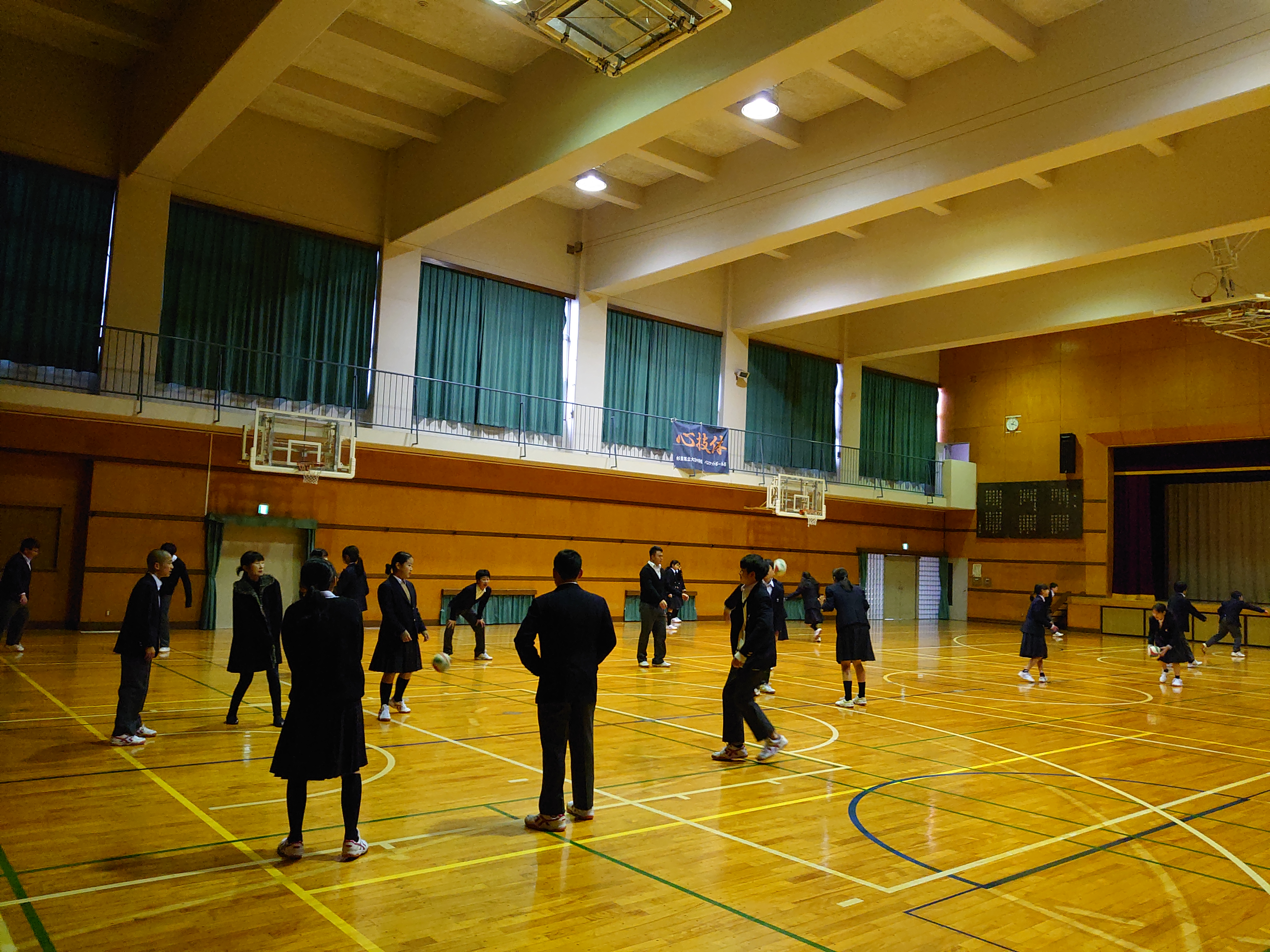 | 雪の予報でしたが、雨に変わりました。晴れていれば 校庭でのボール開放ですが、雨天のため体育館での ボール開放です。代表委員が管理をしてくれています。 多くの生徒さんが遊びに来ています。 マナーを守って楽しみましょう。 |