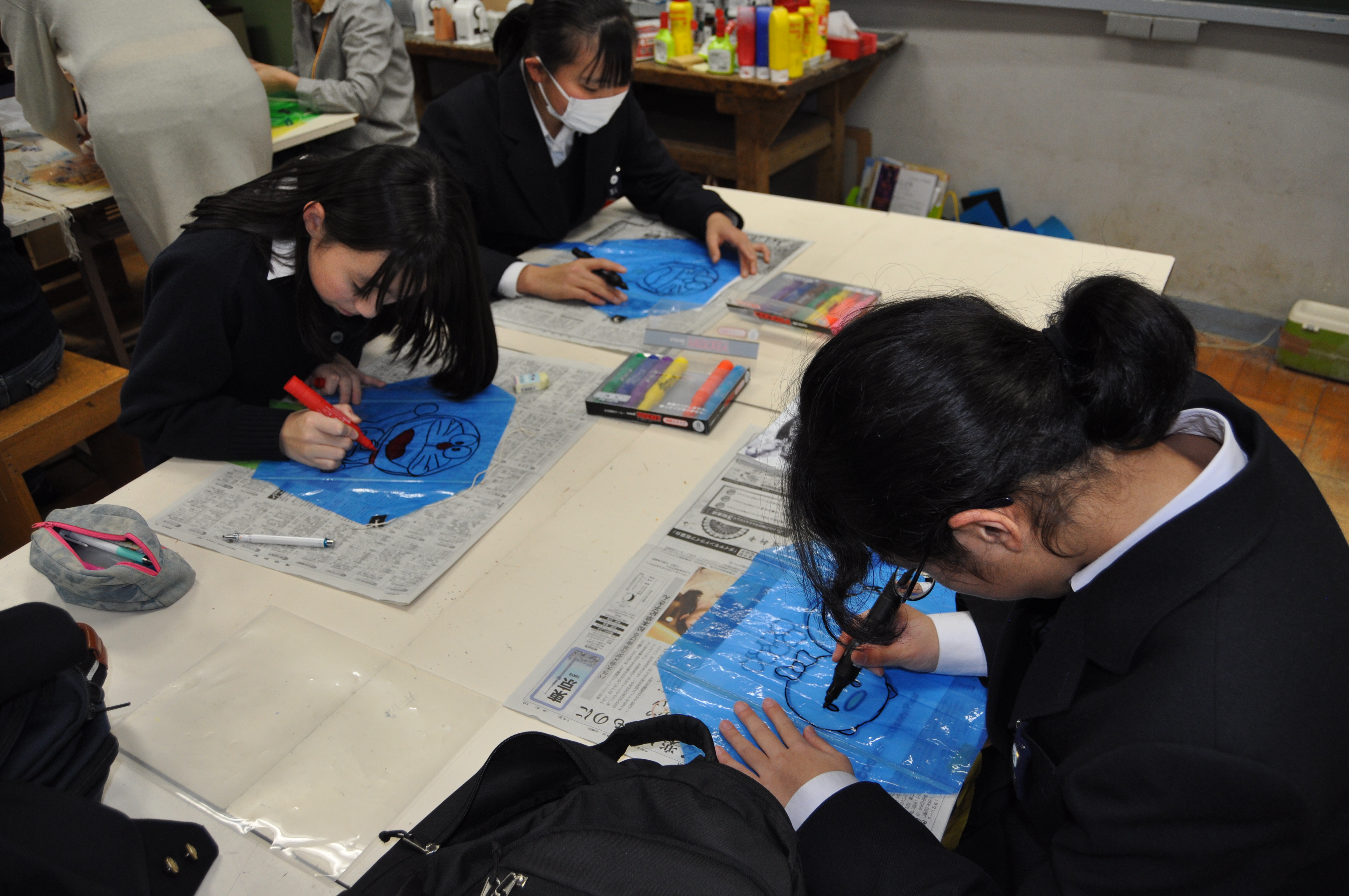 | 地域の堀松梅宮育成委員会の凧あげ大会を控え、 凧つくりを実施しました。ボランティアの生徒さんが 来てくれてビニール凧に絵付けをしました。舞い上 がるのが楽しみです。 |