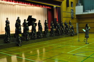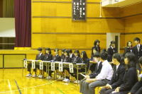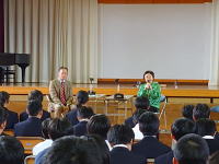 音楽発表会を控え、本物の合唱を聞かせ意欲向上を 図りたいと考えていたところ、本物中の本物、「菊華 アンサンブル」の皆さんが来てくれました。早朝から 集合し、体育館に広がっての発声練習。それだけで 鳥肌ものでした。11月の全国コンクールで歌う合唱 も披露していただき感動のひと時、さらに、各クラス のも指導に回っていただき貴重な時間を持つことが できました。 |