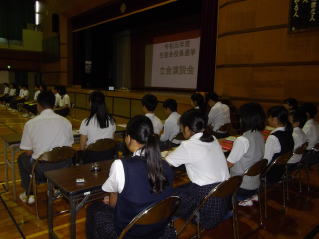 生徒会役員を決める立会演説会が開催されました。 立候補者が、1年生が2名、2年生が2名。応援演説 者も含め、真剣に訴えていました。 |