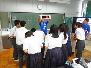 「エネルギー変換に関する技術」の一環で、パナソニックの方をお招きして出前授業の実施。いろいろな実験器具を用いての実践授業。理解が深まったと思います。 写真は、手回し発電での発電実験の結果発表。 |