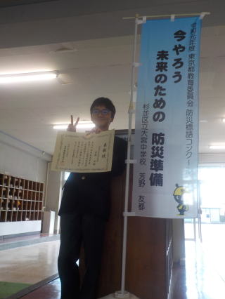 生徒朝会のあと令和元年度東京都教育委員会防災標語コンクールで入選した1年A組芳野友都君へ賞状の授与とのぼりを贈呈しました。のぼりは、今後1年間、飾られます。 |