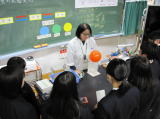 第一学年で理科出前授業が実施されました。「物質の状態状態変化」の題目で、気体を液体に変えたり、液体窒素を用い日ごろ出来ない実験を行いました。 |