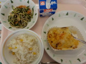 3学期の給食では、6年生が家庭科の時間に考えた献立の中から、特にバランスがよく給食で提供することが可能なものが、何回か取り上げられています。今日は「さつまいもと鶏肉のグラタン」でした。