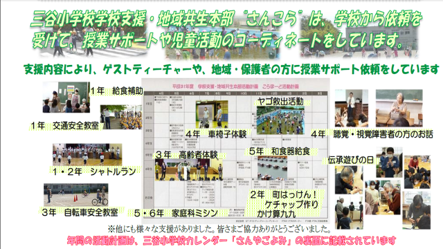 「さんこら」(学校支援・地域共生本部)とは? 日々の学習指導を今まで以上に充実させていくために仕事をしています。教職員と協力しながら、地域の人間として学校教育や子育ての中で協力できることをサポートしています 「こらぼーど」(活動計画) こらぼーど おたより 《令和5年度》 こらぼ表 こらぼ裏 《令和3年度》 こらぼ表 こらぼ裏 主な活動