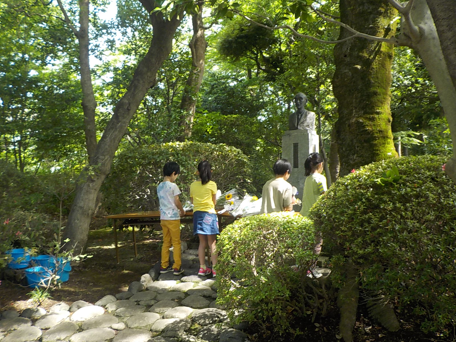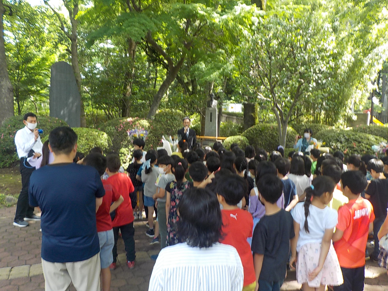6月1日は、済美小に関わりの深い今井政吉先生の命日であり、毎年済美教育センターにある今井先生の胸像前で献花式が行われます。済美小は3年生が参加し、感謝の気持ちを代表児童が述べ、今井先生へ花を手向けました。今井先生は日本済美学校の土地を杉並区に寄付し、その後今井先生の意向を受け、その地に済美小、済美教育センター、済美養護学校が建ちました。また、済美小の校歌の作詞もされた方です。