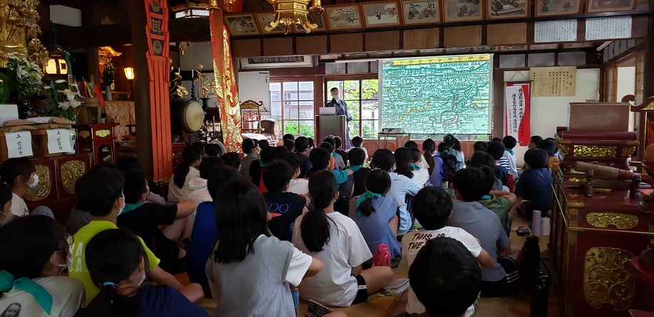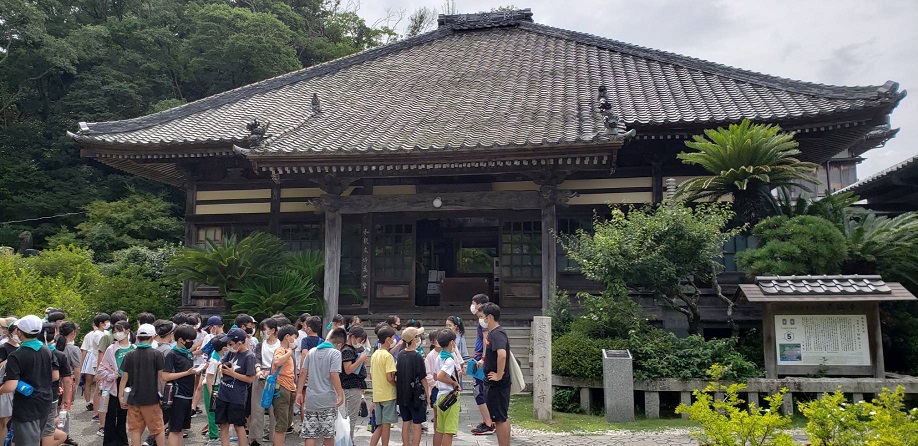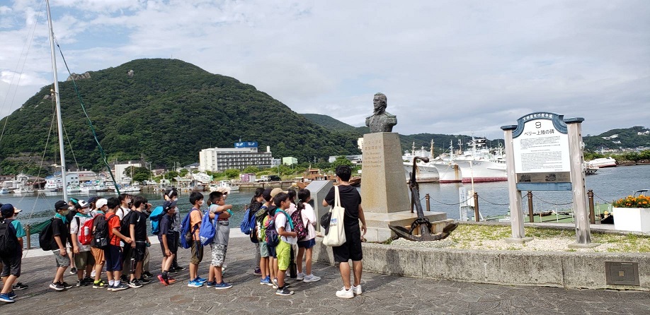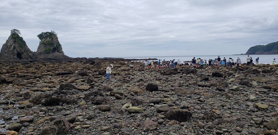 午前中は、逢ヶ浜で磯観察を行い、カニやナマコなど磯の生き物と触れあいました。午後は、天気も良くなり、了仙寺で開国のお話を聞き、ペリー上陸記念碑など下田の町を散策しました。この後は、宿舎に戻って入浴と楽しみなお土産の購入です。
