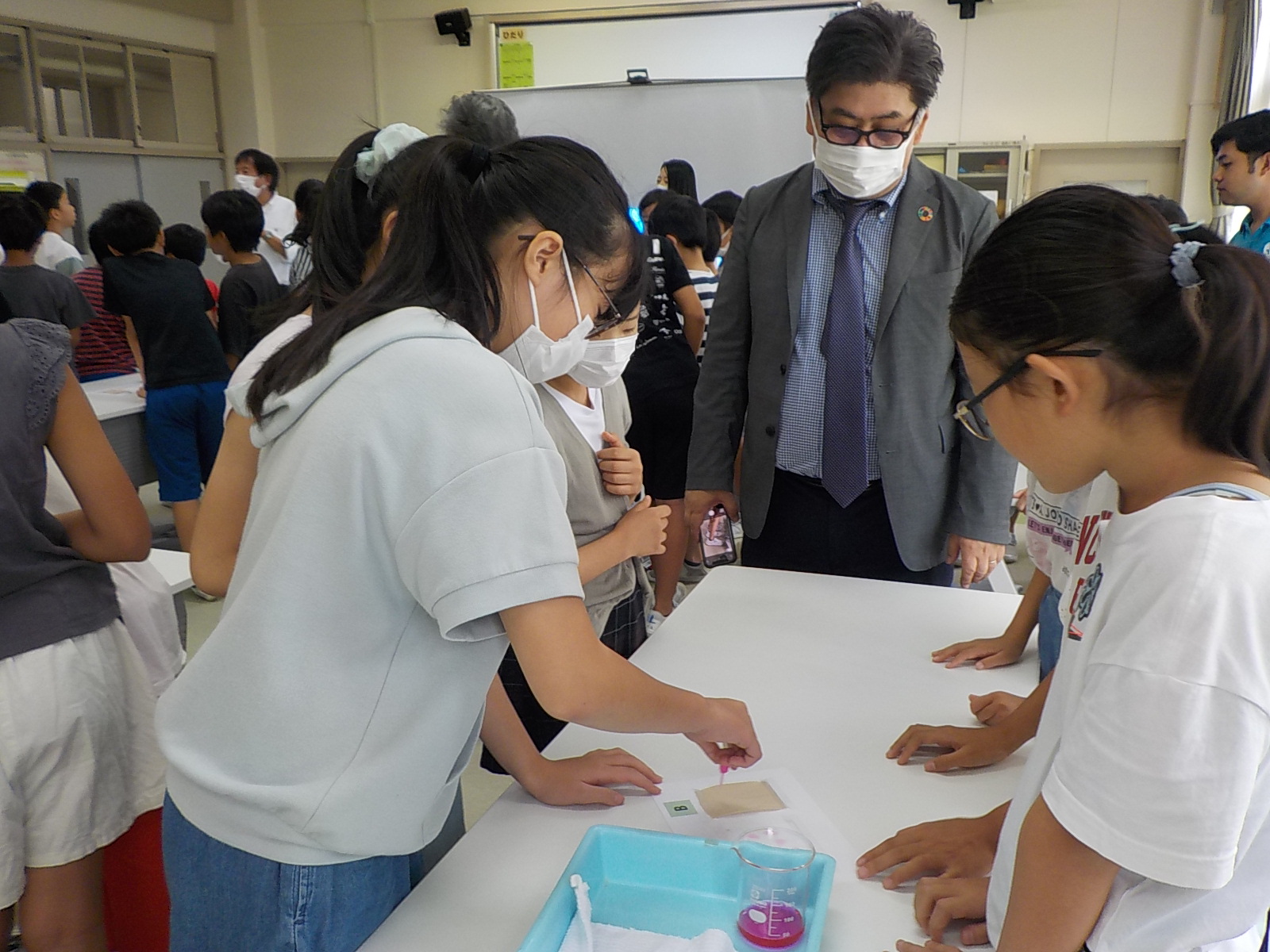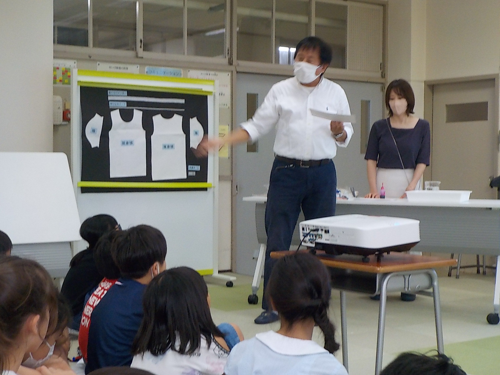 1学期から続けている企業と連携した5年生のSDGs学習が行われました。肌着の製造についてお話を聞きながら、製品開発にどのような努力をしているか学びました。布の吸水実験などを通して、子供たちの意見を今後の商品開発に生かしてもらいます。