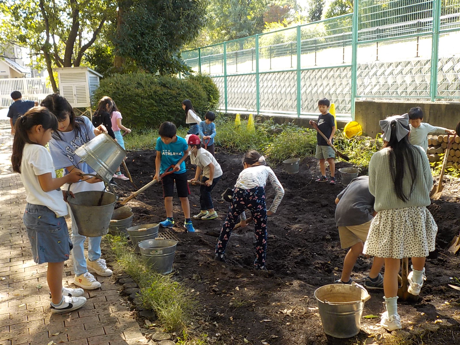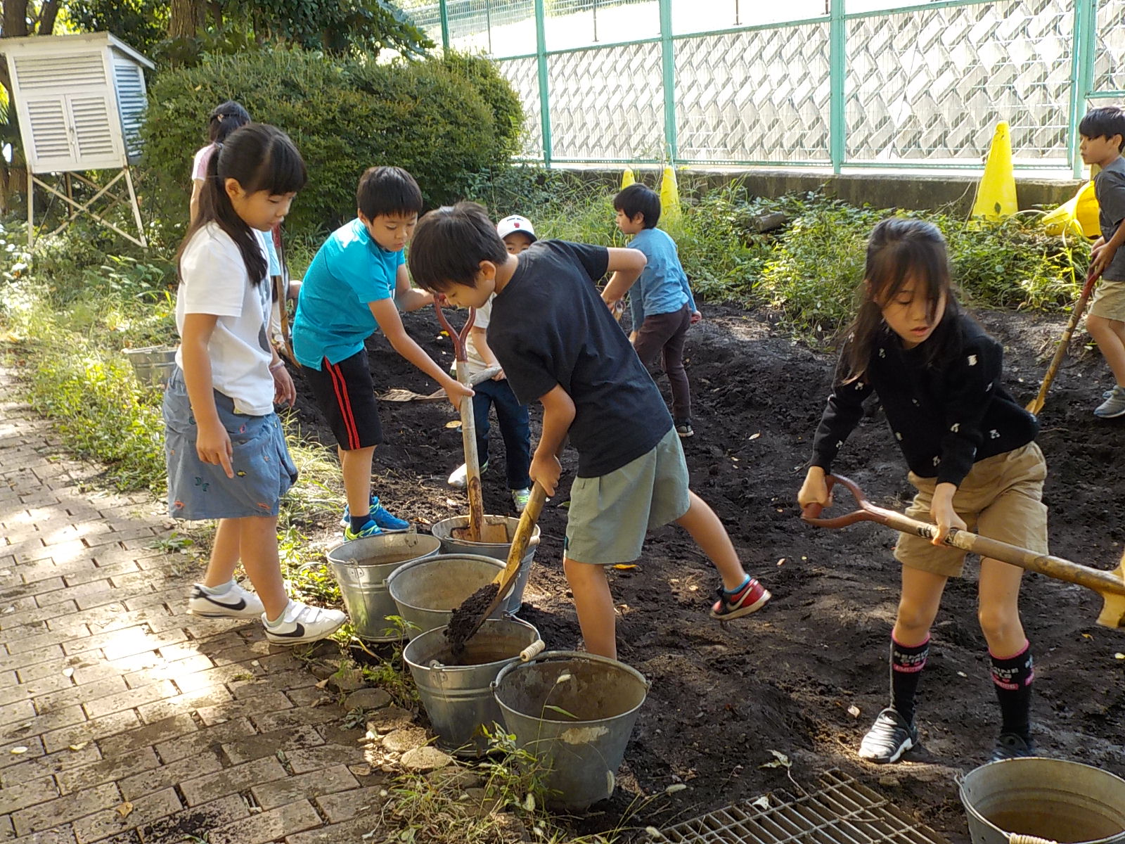 6月から済美の森のビオトープ作りに全校で取り組んでいます。休み時間になると子供たちが慣れた手つきで土を掘り起こしビオトープづくりに汗を流しています。一人の力は小さくてもみんなで続けると大きな力になります。ビオトープが出来上がる日を目指して日々頑張っています。