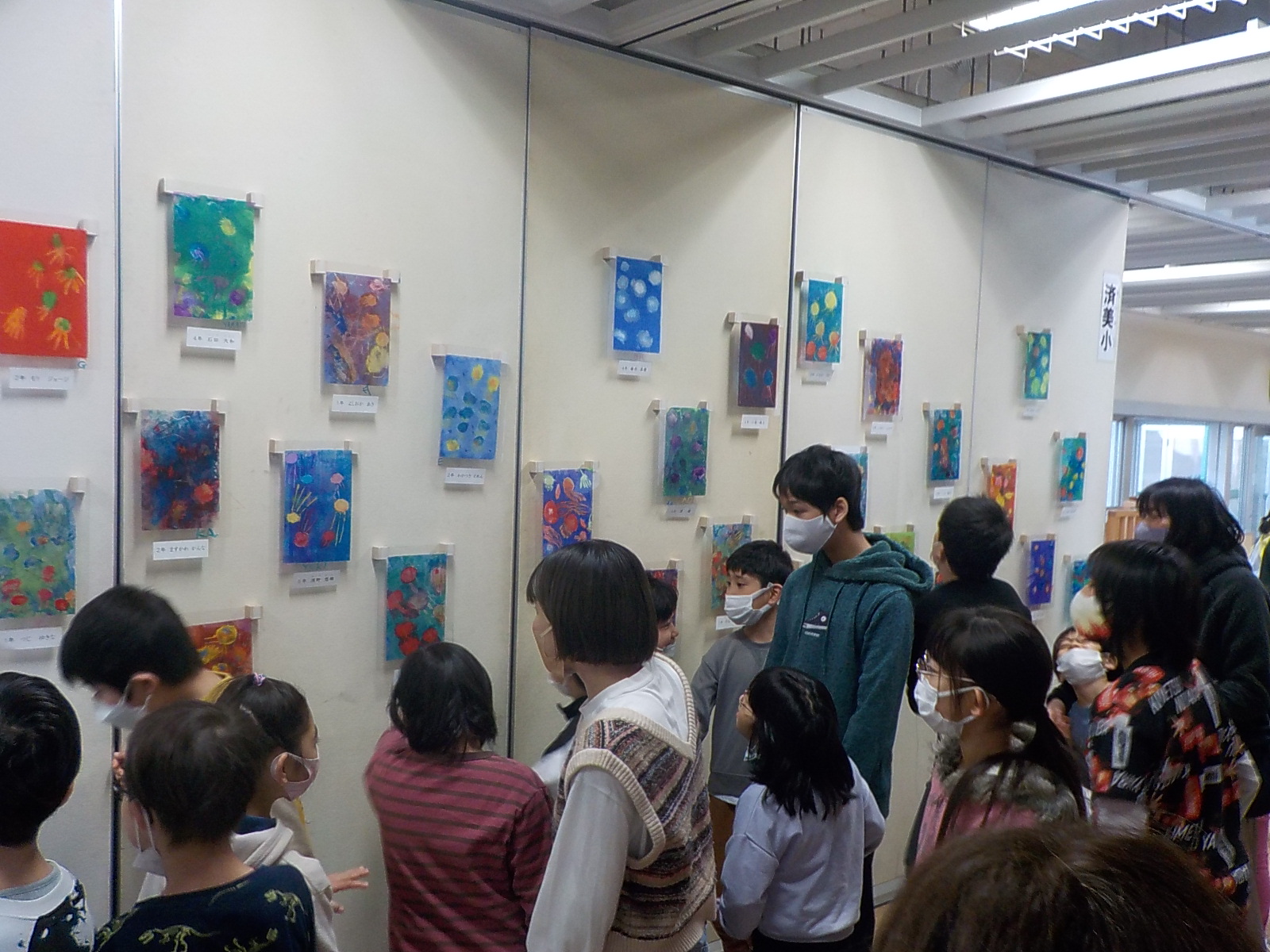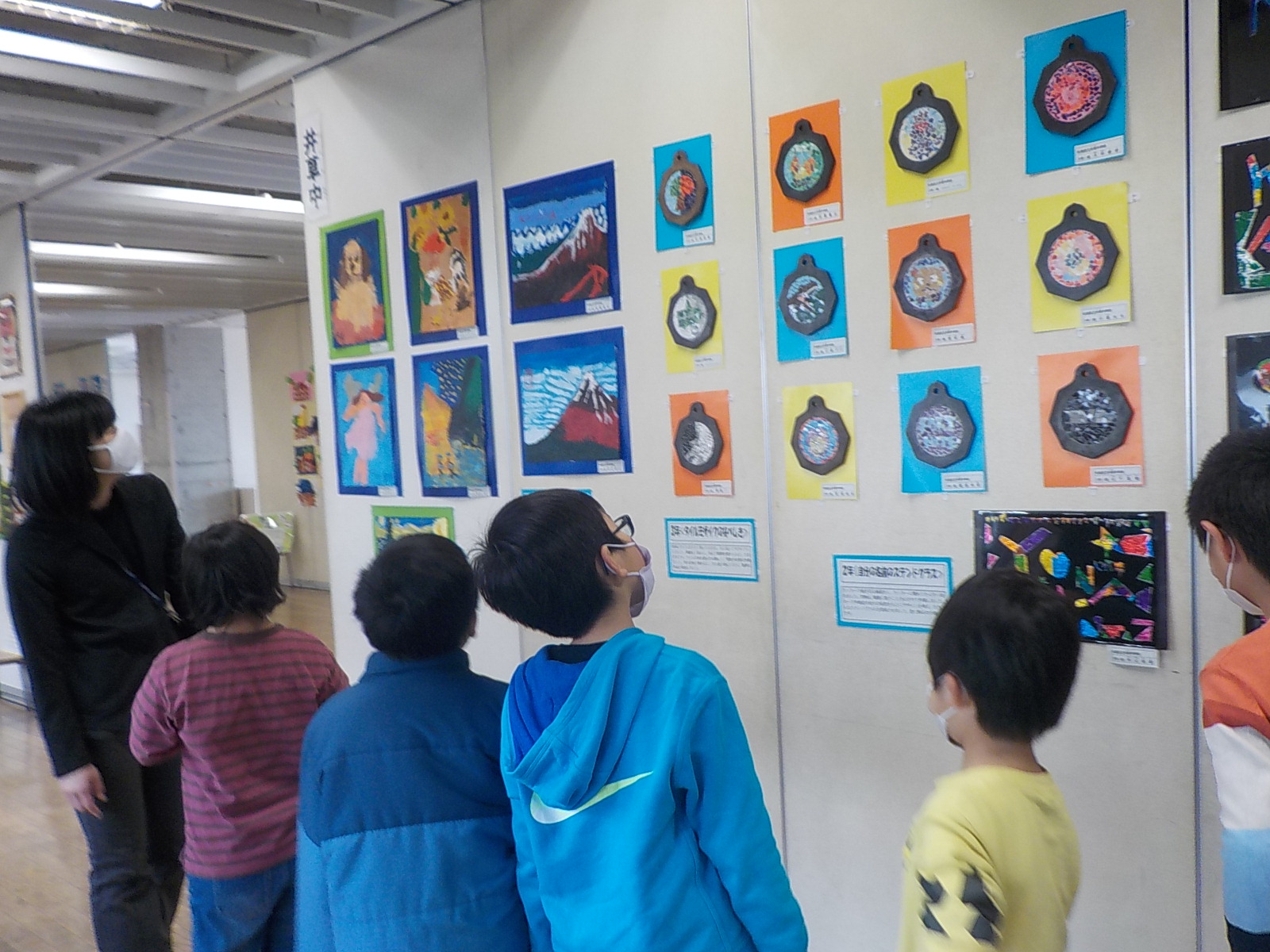 かしのみ学級の子どもたちが、杉並区特別支援学級連合展覧会の見学をしました。例年セシオン杉並で行われますが、工事のため今年は元杉並第四小の校舎で行われました。今年は平面作品1点のみの展示でしたが、自分の作品を見つけると笑顔で喜ぶ姿が見られました。