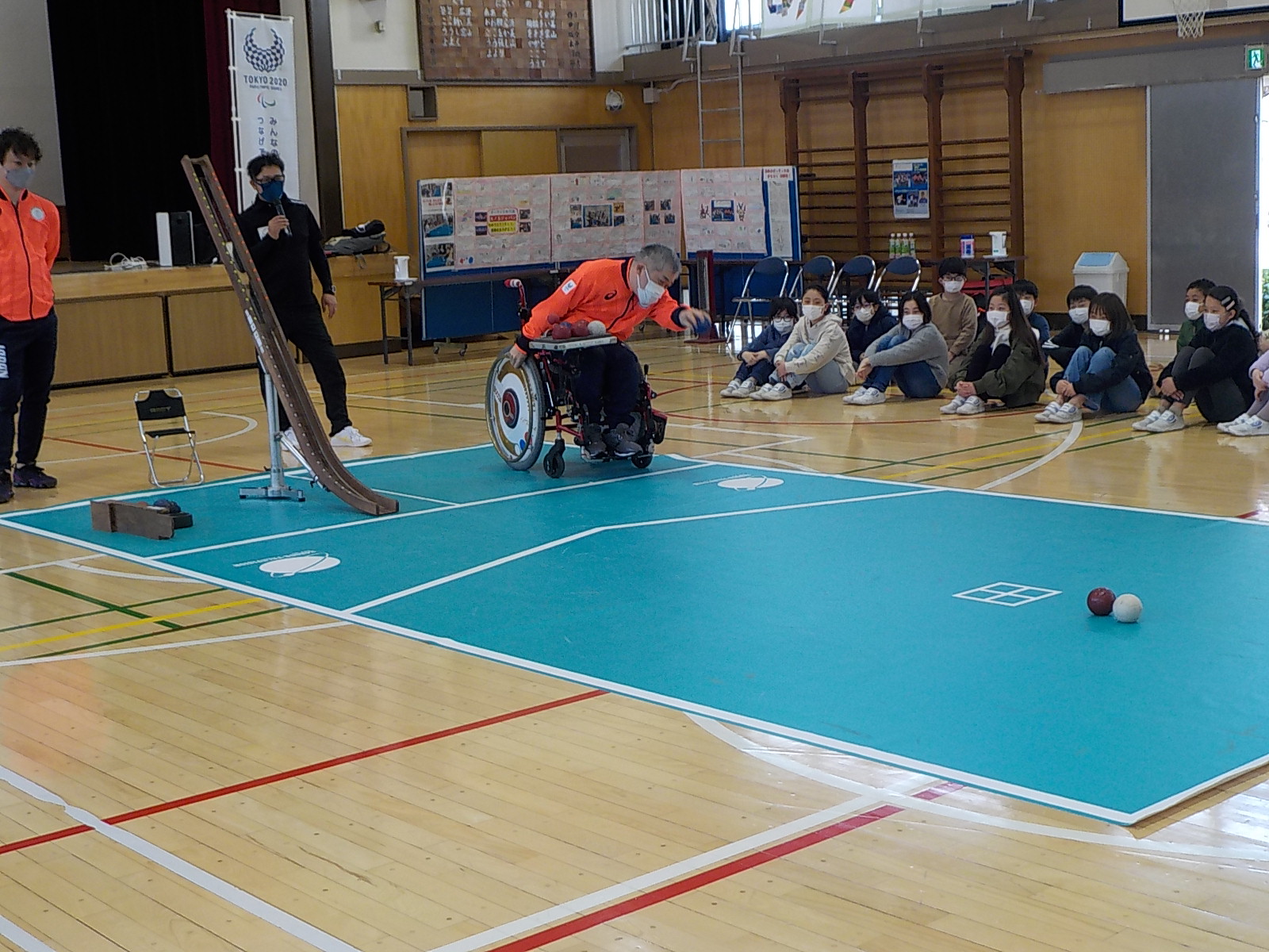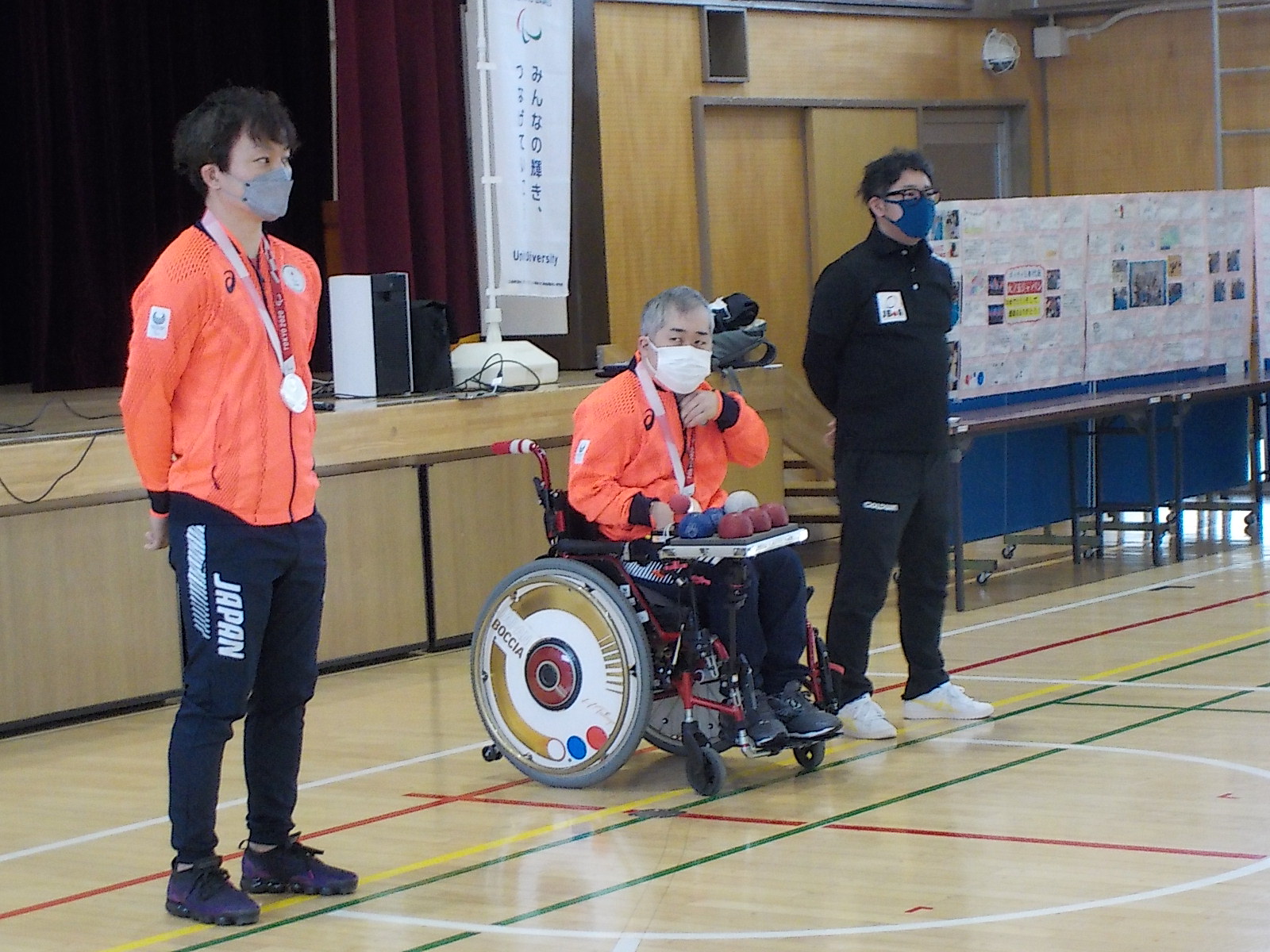 東京パラリンピックボッチャ選手をお招きし、ボッチャの特別授業を実施しました。銅メダリストの廣瀬隆喜選手、競技アシスタント銀メダリストの垰田祐志郎選手、ボッチャ日本代表監督の村上光輝さんに来校いただきました。世界一流のプレーを目の前で見せてもらい、子どもたちの質問にも丁寧にお答えいただきました。村上監督のお話からは仲間と仲良くなること、お互いを応援しあうことの大切さを学ぶことができました。
