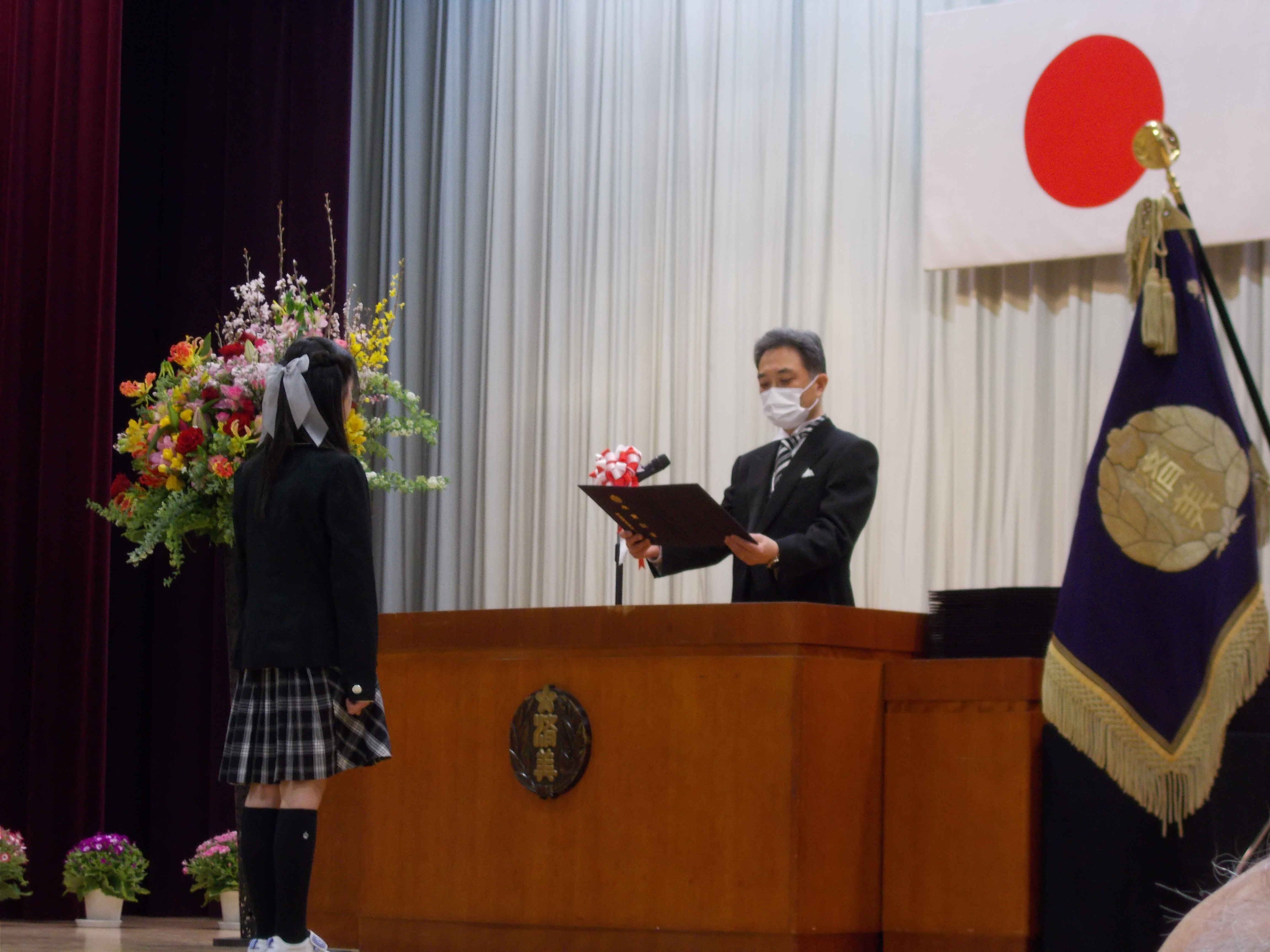 令和3年度の修了式が行われました。修了式では校長先生から「節目の日」の大切さについてお話がありました。また、オリパラ教育アワード校として表彰され副賞としていただいた聖火ランナーのユニホームが紹介されました。式の最後には、各クラスの代表児童が修了証を受け取り、教室では一人一人に通知表が手渡されました。